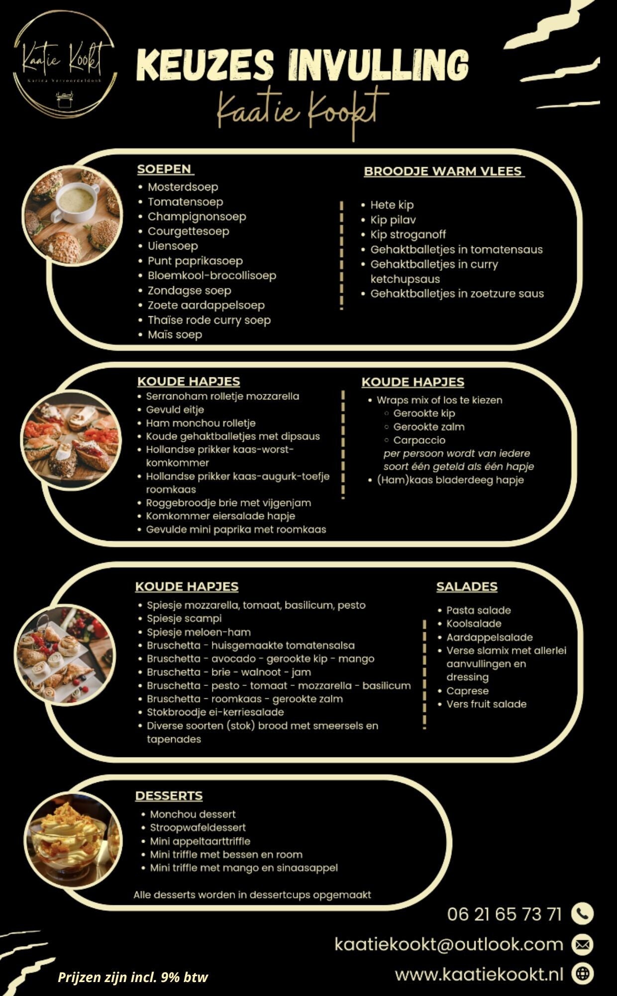 Bestel jouw buffet vanaf 15 personen. Stel jouw eigen buffet samen door jouw eigen gerechtjes te kiezen uit onderstaand overzicht. Dan maken we er samen een feestje van! Bij vragen neem gerust even contact op.